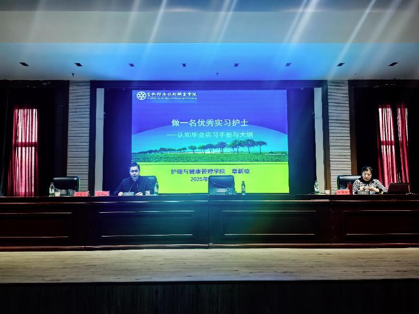 紧接着,护理与健康管理学院院长章新琼对毕业实习手册与大纲进行了详细解读。她结合临床实习的实际需求,详细阐述了实习生在临床实习过程中需要掌握的知识与技能,包括护理基本操作、病情观察、患者沟通、团队协作等方面。章新琼表示,实习是护理教育的重要环节,是同学们将理论知识转化为实践能力的重要途径。她要求,同学们要认真对待实习,严格遵守实习纪律,积极参与临床实践,不断提高自己的专业技能和综合素质。章新琼的讲解深入浅出,条理清晰,为同学们明确了实习目标和方向,有助于他们在实习中有的放矢,不断提升自己的综合素质。