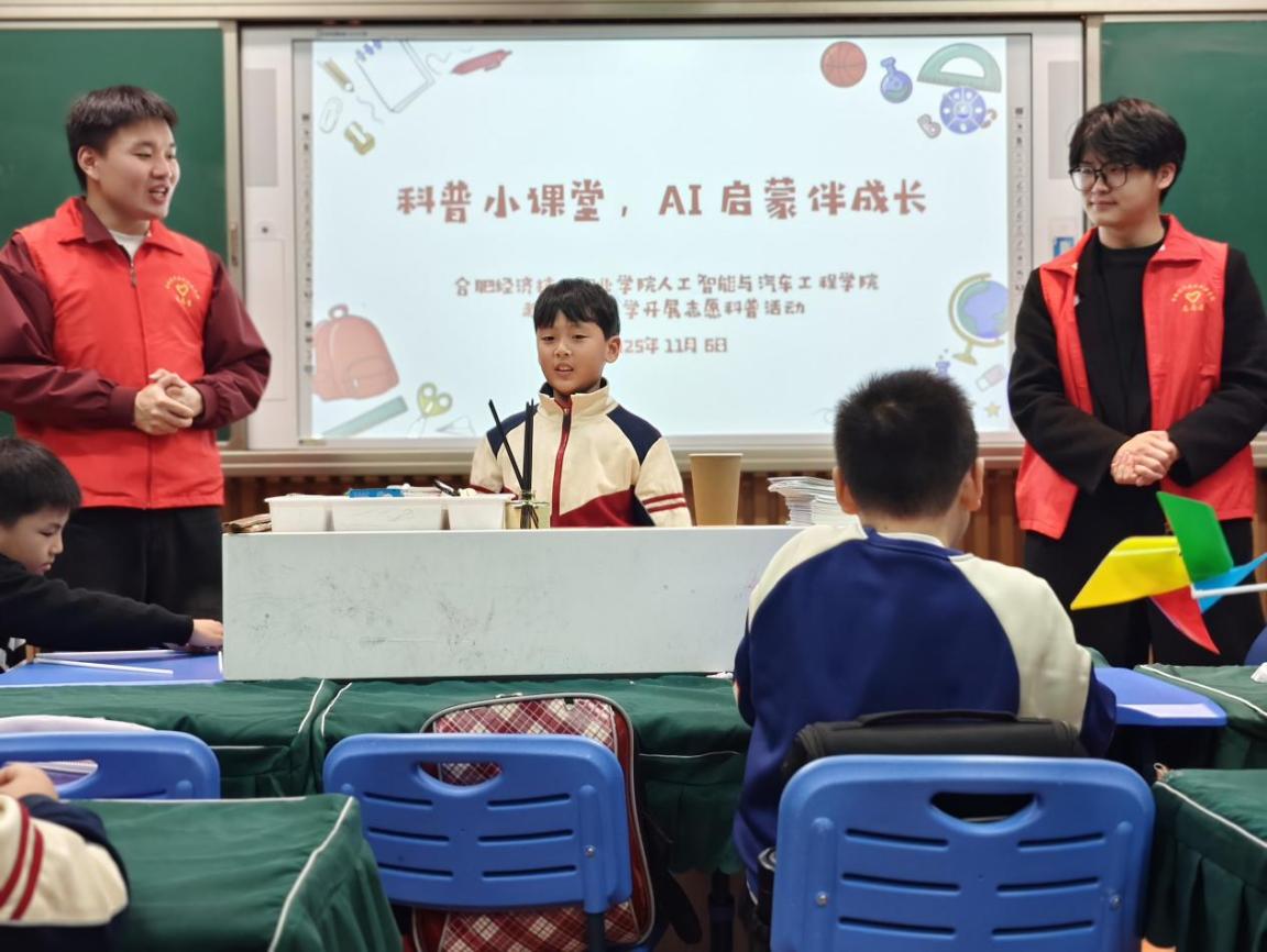 为激发青少年科学探索兴趣,普及人工智能前沿知识,11月6日下午,人工智能与汽车工程学院党支部书记袁小翠、团总支书记周林带领11名志愿者赴合肥市永红路小学,为该校三(5)青云中队的54名学生开展“科普小课堂,AI启蒙伴成长”科普志愿活动。活动以AI科普讲解、手工制作与梦想分享相结合的形式,为孩子们打造了一场兼具知识性与趣味性的成长体验。