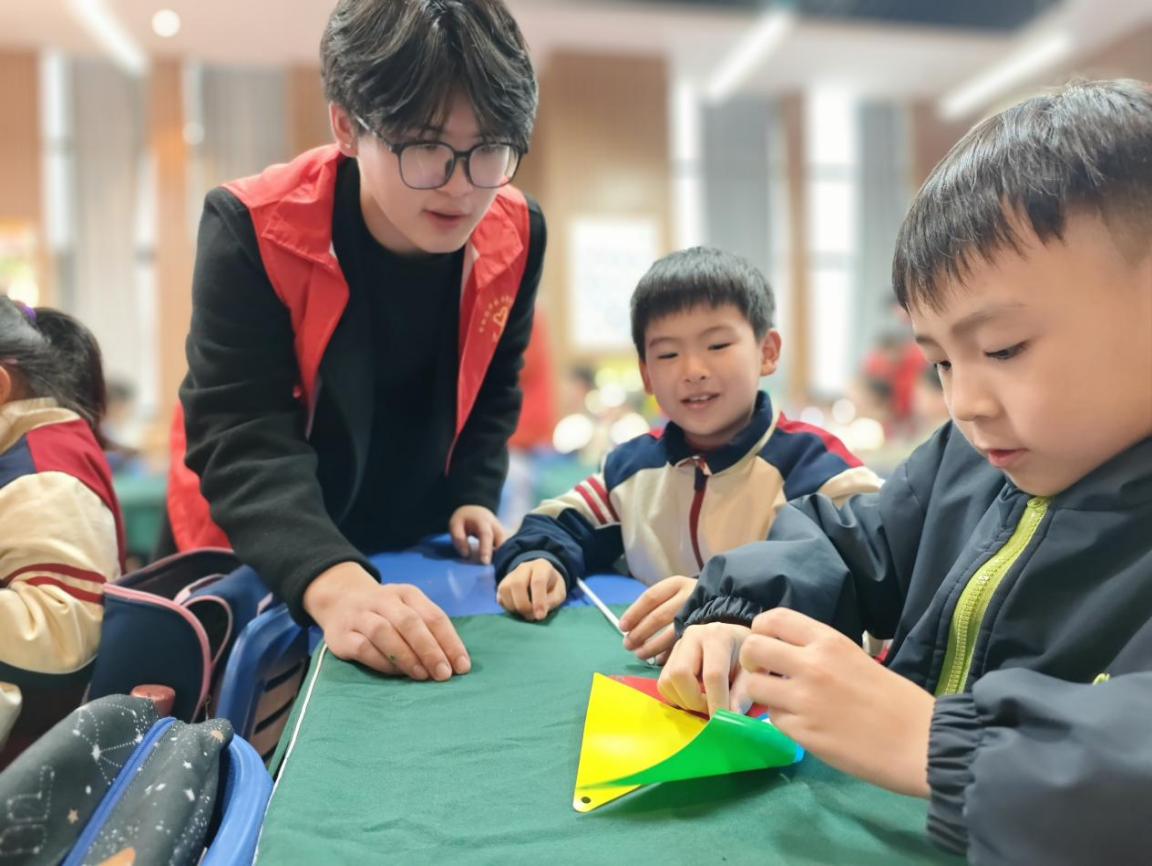 手工制作环节聚焦实践育人,志愿者为孩子们分发五彩风筝制作材料,耐心讲解裁剪、组装等步骤,并在现场巡回指导。完成后,孩子们兴奋地展示作品,五彩风车随风转动,传递出快乐与温暖,也锻炼了他们的动手能力和创造力。