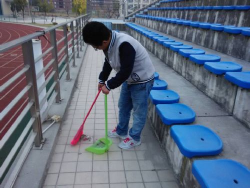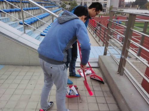 下午,参加志愿服务的学生带着清洁工具在操场集合,他们以部门为单位分工合作,对人工草坪、看台及操场附近外围区域的饮料瓶、食品包装物、烟头、瓜子皮、碎纸、落叶等杂物进行认真清理。经过一个多小时的清扫,操场清洁如新。