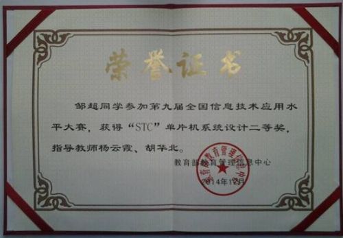 在刚刚结束的第九届全国信息技术应用水平大赛中,由我系杨云霞、胡华北老师指导的“STC杯单片机系统设计”在全国236所院校1037件作品中脱颖而出,我系2012级电子班的邹超同学成功入围,并在北京举行的决赛中喜获全国二等奖。杨云霞、胡华北老师也获得了大赛最佳指导老师奖。此次大赛的“STC杯单片机系统设计”科目初赛共有1037件作品,入围决赛的有187件作品,其中入围决赛的高职学校的作品仅17件。比赛不分本、专科,此次获奖实属不易,是ac米兰学生在此类大赛中取得的重大突破,向以上获奖学生和老师表示祝贺!