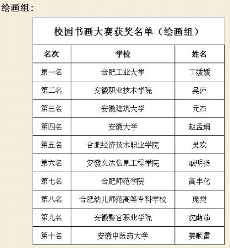 合肥大学生文化艺术季由中共合肥市委宣传部、共青团合肥市委员会主办,是一年一次覆盖全市所有高校的大型校园文艺活动,至今已连续举办三届。活动包括歌手、舞蹈、书画、摄影、微电影五项比赛,2014合肥大学生文化艺术季校园书画大赛从9月到12月,历时4个月,覆盖全市50所高校,吸引3000余名爱好书画的同学,参赛作品高达上万份。本次比赛我院艺术系潘晓虎教师带领14广告二班吴欢同学,积极准备美术作品,最终取得第五名(三等奖)的好成绩。