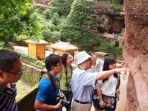 进入白岳胜景,课题组成员一边听着邢乐澄组长讲解丹霞地貌的旅游地学构成,一边考察望仙亭、真仙洞府、月华街、太素宫、玉虚宫等景点,系统了解丹霞地貌旅游知识的同时也实地感受了齐云山长期以来积累的道教文化遗存。