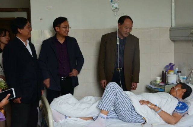 2016年5月13日上午九点钟,副院长杜俊林、管理系主任唐世杰和学生处副处长陈伟邦带领青年志愿者协会的志愿者们抵达安徽省第二人民医院。他们代表我院全体师生对王松林及其家庭表示深切的慰问与祝福。看到躺在病床上的王松林,杜俊林紧紧握着王松林的手说:“阳光总在风雨后,希望你能坚定地渡过难关,我们会给予你们最大的帮助,你放心,这个世界从来都不缺少爱。”当我们把爱心捐款交付给王松林的家人时,他们的脸上露出了久违的笑容,同时也流出了因感动而流下的泪水。