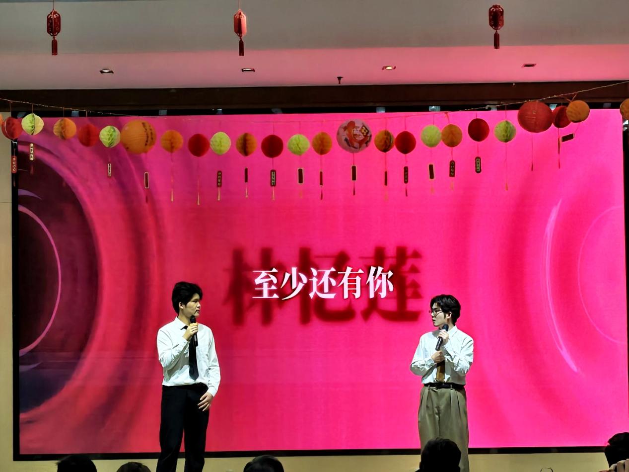晚会演出环节精彩纷呈、高潮迭起。开场舞《奔跑的青春》以动感十足的舞姿、朝气蓬勃的风貌,瞬间点燃全场热情;何一凡老师与陶晨旭携手演绎的《至少还有你》,师生温情对唱,传递出师生间的深厚情谊,让现场暖意涌动;朗诵《这盛世如你所愿》字字铿锵、句句有力,深情诠释了新时代青年的责任与担当,引发全场强烈共鸣;T台秀《All Designer》创意十足,学子们以自信的姿态展现出别样时尚品味与青春活力;此外,歌曲演唱、乐队演奏、幽默小品等节目轮番登场,人汽学院辅导员和学生们倾力演绎,节目风格多元、内容丰富,赢得现场师生阵阵掌声与喝彩。最终,晚会在学生会全体成员合唱的《桃花朵朵开》中温馨落幕,熟悉的旋律传递着团圆与喜悦,为整场晚会画上圆满句号。
