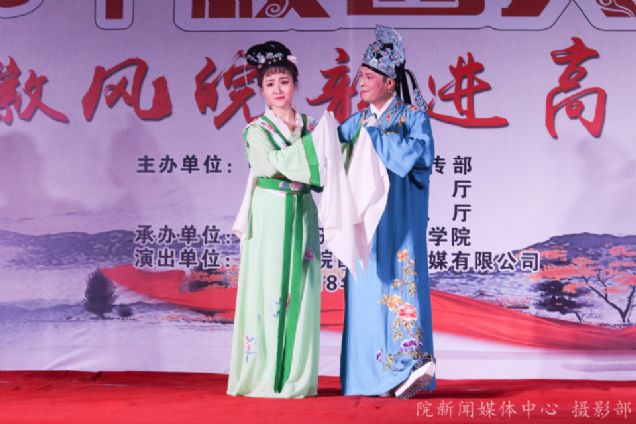 庐剧小戏《锅台县令》正式拉开了演出的序幕,该戏主题鲜明,剧情精练,具有很强的教育意义。县令以锅台为现场,农院做公堂,查明真相,伸张正义;《莫愁女》选段《白兰花含笑假山旁》,唱腔优美婉转,极具安徽庐剧特色;《健康扶贫上路》这类新编庐剧小戏通俗易懂,别具风味;《看相》这一传统庐剧将现场氛围推向高潮,赢得了观众们的阵阵掌声;最后,《借罗衣》行云流水、深情并茂的表演,将传统地方戏曲以其独特的艺术表现形式呈现在舞台上,让广大师生近距离领略了庐剧的魅力,了解庐剧这一国家非物质文化遗产。