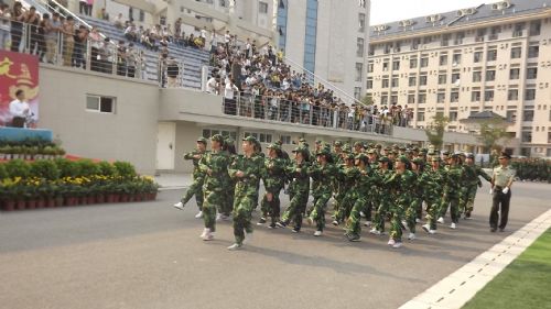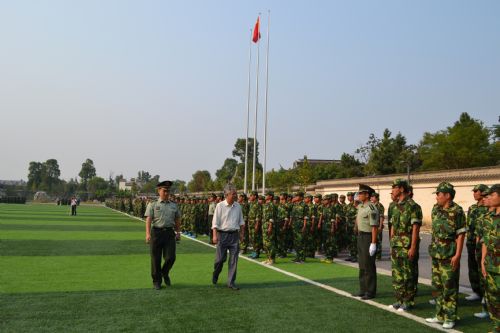 同学们身着迷彩服,队伍整齐、精神抖擞、英姿勃发,用高昂的声音向首长问好。