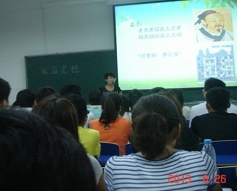 思政部张福珍老师讲课的是《思想道德修养与法律基础》中的一个章节“家庭美德”。她绘声绘色的讲解,图文并茂的课件.把如何处理好家庭关系、邻里关系,婚姻法中的男女平等以及怎样才真正做到尊老爱幼等道理,深入浅出,演绎的淋漓尽致。一首“你见或不见,父母就在那里;你想或不想,思念就在那里;你回或不回,家就在那里;你爱或不爱,爱就在那里。”的短诗,让在场的师生为之动容。