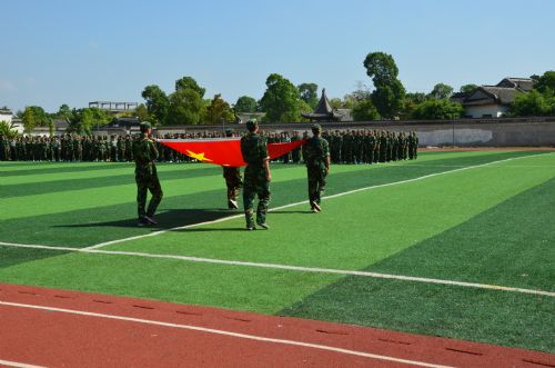 大会现场举行了庄重的升旗仪式。随后,学院党委书记徐麟在王瑞连长的陪同下,检阅了新生方阵。