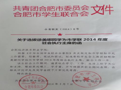 根据共青团合肥市委员会、合肥市学生联合会〔2014〕8号文件,我院学生会主席团助理徐美娜同学荣幸当选为市学联2014年度驻会执行主席,工作为期一年。
