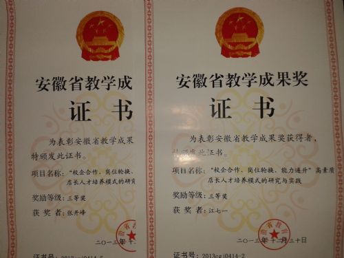 我院经济贸易系教学副主任江七一和教务处副处长张开峰,与安徽工商职业学院合作,联合申报的《“校企合作、岗位轮换、能力递升”高素质店长人才培养模式的研究与实践》教研项目喜获省教育厅颁发的安徽省教学成果三等奖。