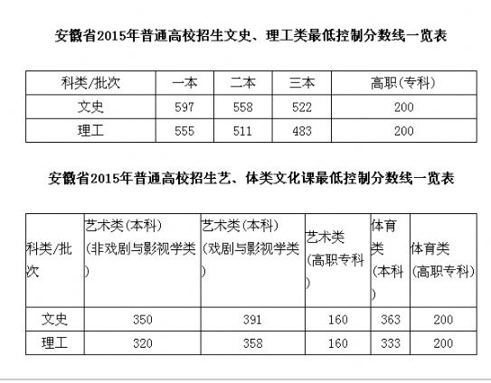 2015年安徽高考录取分数线公布