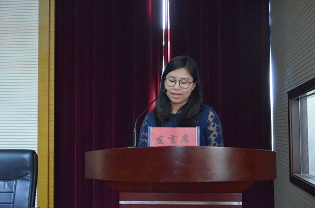 吴姗珊老师作为教师代表进行发言。她用幽默的语言带着毕业生们一起追忆他们美好的大学时光并对大家提出三点建议:男孩子要以事业为重,对社会、工作和家庭要有高度的责任感;女孩子要多读书,注重自身气质的培养;毕业以后要高调做事,低调做人。