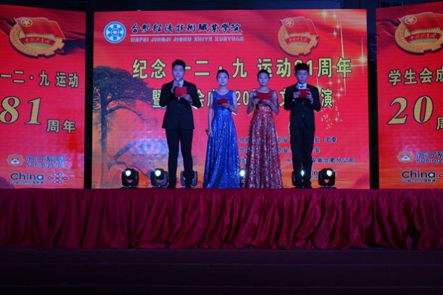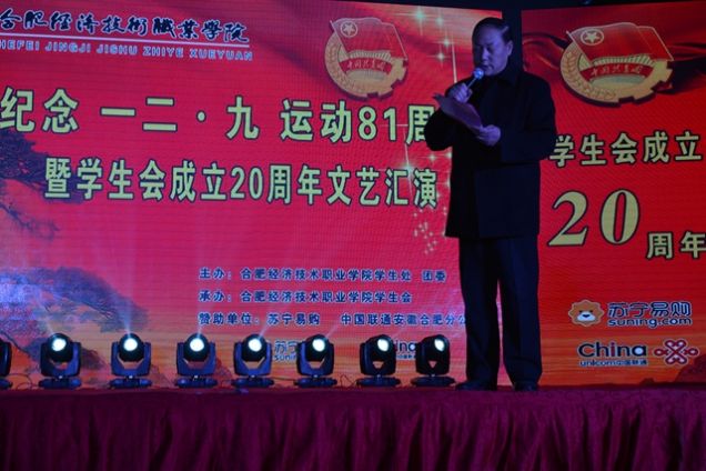 2016年12月8日18时,我院纪念一二九运动81周年暨学生会成立20周年文艺汇演在学院田径场隆重拉开帷幕。此次汇演到场的领导和嘉宾有:党委委员、副院长杜俊林,党委委员、副院长沈宏毅,党委委员、招生就业处处长章六七,教务处处长许克维,学生处副处长、团委书记陈伟邦,思政部主任仇志芬,安徽省学生联合会驻会主席郑业,合肥市学生联合会驻会主席王辉以及来自13所兄弟高校的学生会代表。