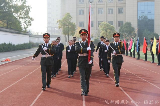 开幕式进行到第三项“升国旗、奏国歌”,全场迅速安静下来,主席台上的各位领导注视着前方。听,一阵整齐有力的踏步声在升旗台响起;看,院国旗护卫队的成员们护着国旗走向升旗台。鲜艳的五星红旗在同学们的注视中冉冉升起。
