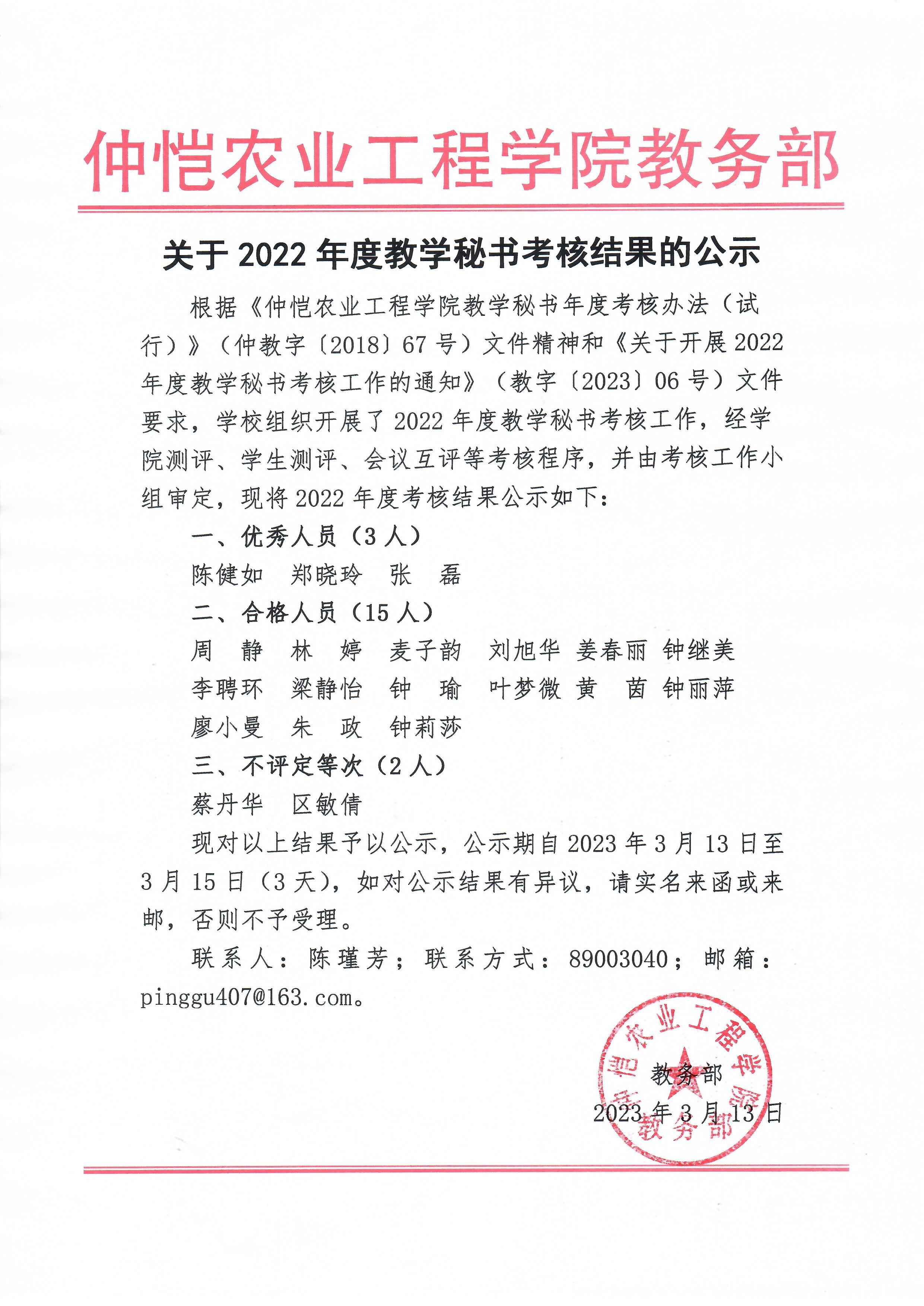关于2022年度教学秘书考核结果的公示
